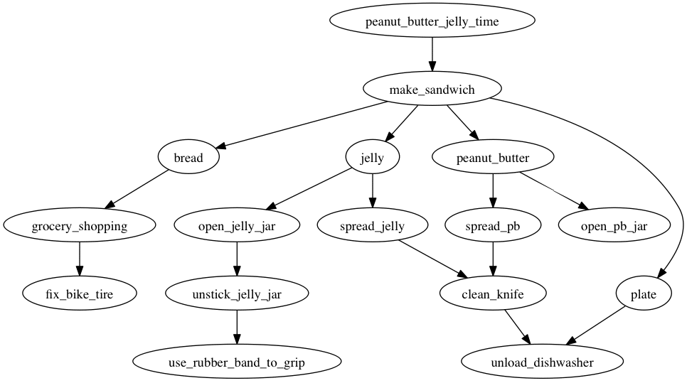 Here’s DOT code for a task diagram about making a peanut butter and jelly sandwich:
