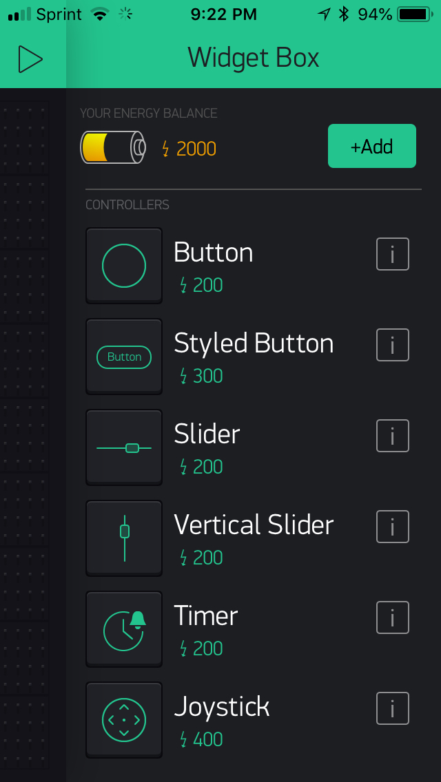 The canvas is a grid to which you can add widgets to build your user interface. To add a widget, tap anywhere on the grid, and the Widget Box menu will be displayed.