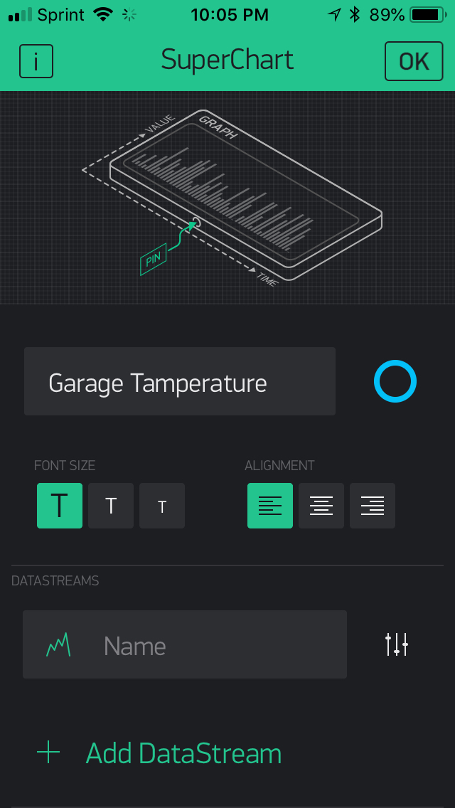 In addition to displaying the current “live” temperature from my device, I also want my app to display a chart which shows the temperature time. Amazingly, this is just as simple as setting up the live temperature. All you need to do is add a SuperChart widget and select the same pin (in my case, V1) as the input data source.