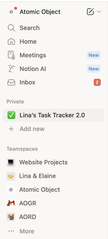 Once you’re in Notion, it’s time to set up your new digital home. The beauty of Notion is how easily you can build separate pages or databases for each focus area. What’s worked best for me is separating out my work across teamspaces. Each of my distinct larger buckets of work gets its own teamspace, which allows me to keep everything I want for each bucket housed together. My teamspaces are: