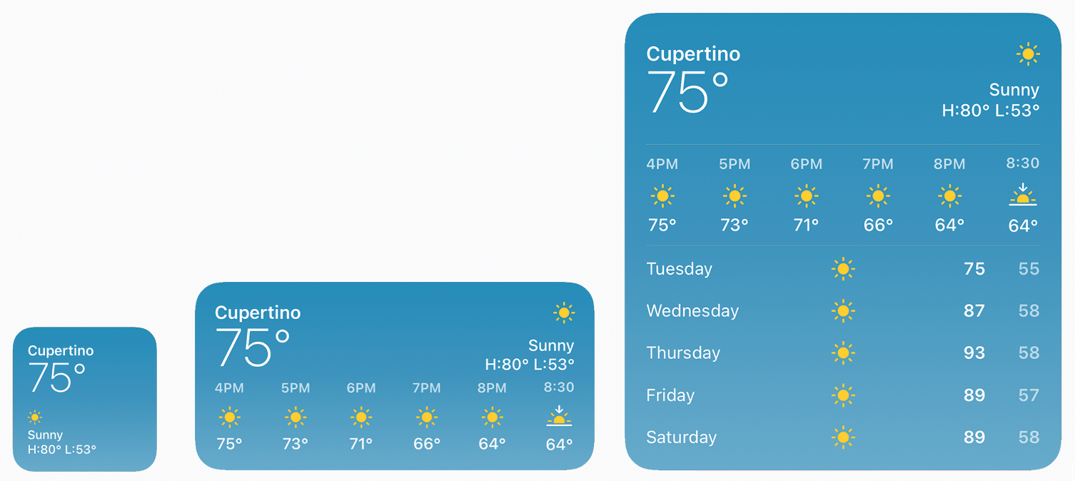 Apple gives us a lot of flexibility in what we can do with widgets and what they can look like. In fact, we can choose to support up to three different widget sizes, giving users the option to display a wide range of information and consume various amounts of real estate on their home screen. For example, the image below shows the three different size options that are available for Apple’s Weather app.