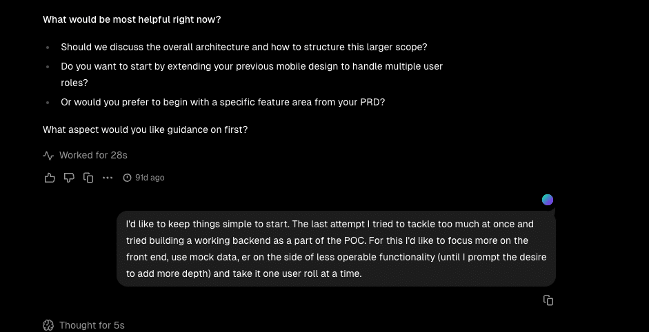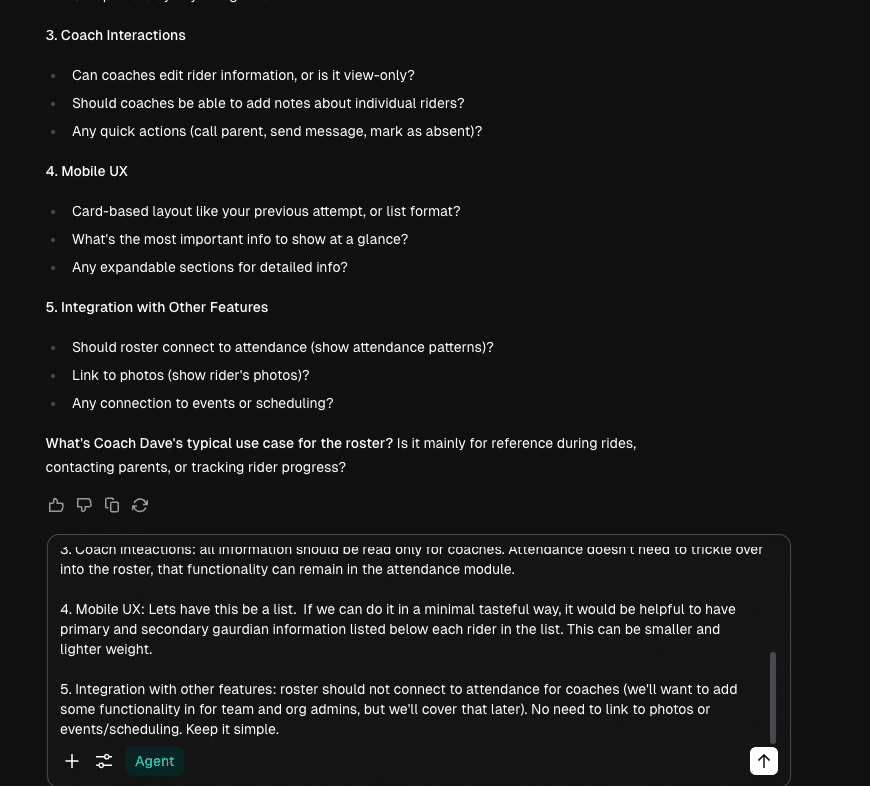 Instead of battling a rigid PRD template, I was able to stay fully in “user empathy mode.” The tool let me talk through each user type, their needs, and the platform’s required functionality as if I were having a casual conversation with a colleague.