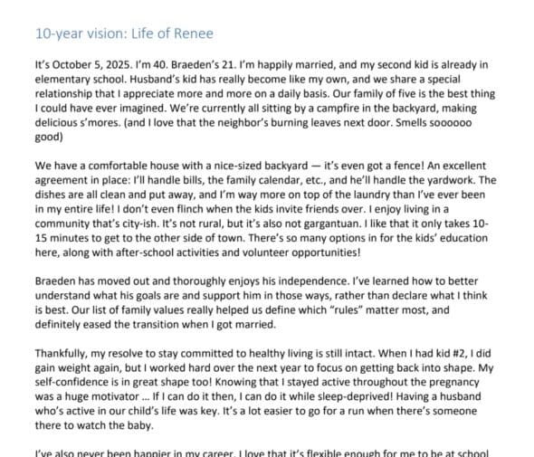 Visioning isn’t about predicting the future; it’s about choosing a direction. When you take the time to describe what you want your life to feel like, some amazing things happen! You stop reacting and start deciding. What not to do becomes clear. You create optimism that’s rooted in reality. You make better day-to-day tradeoffs.
