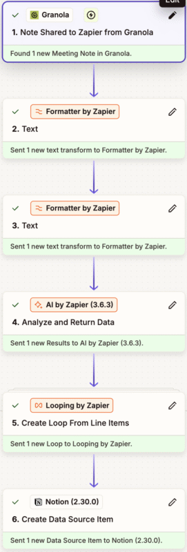 I created a custom recipe in Granola to generate action items in a format that could be understood by Zapier and would map to the task management database in Notion.